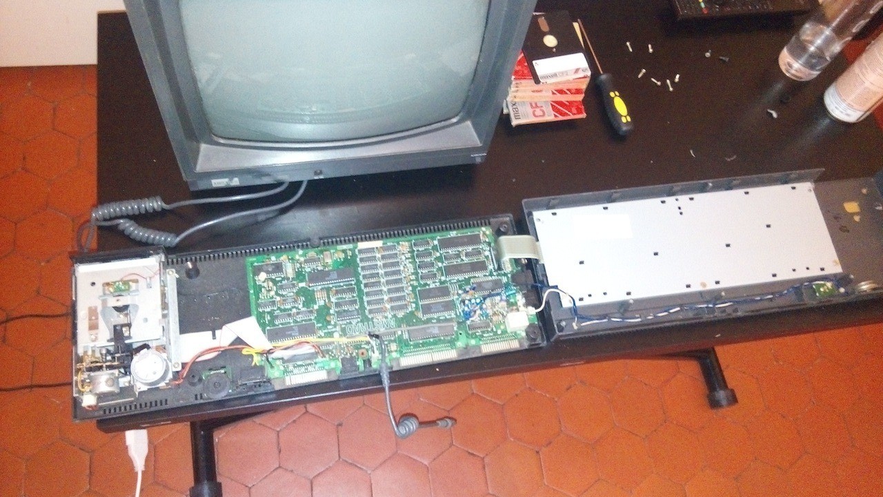 Ultra simple, on le retourne et on ôte au cruciforme les vis présentent sous l’ordi plus les deux vis situées sur le côté du lecteur de disquettes.