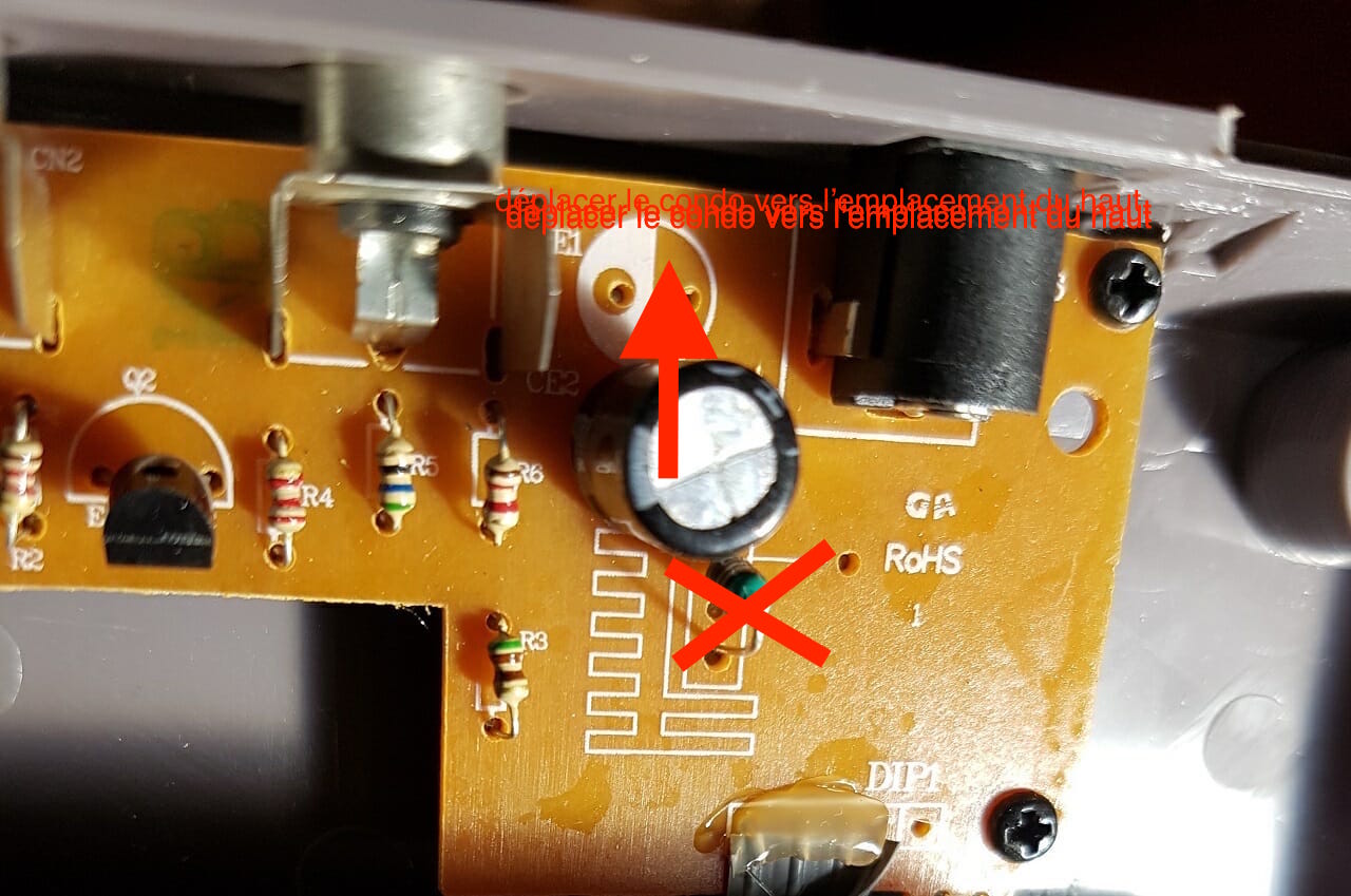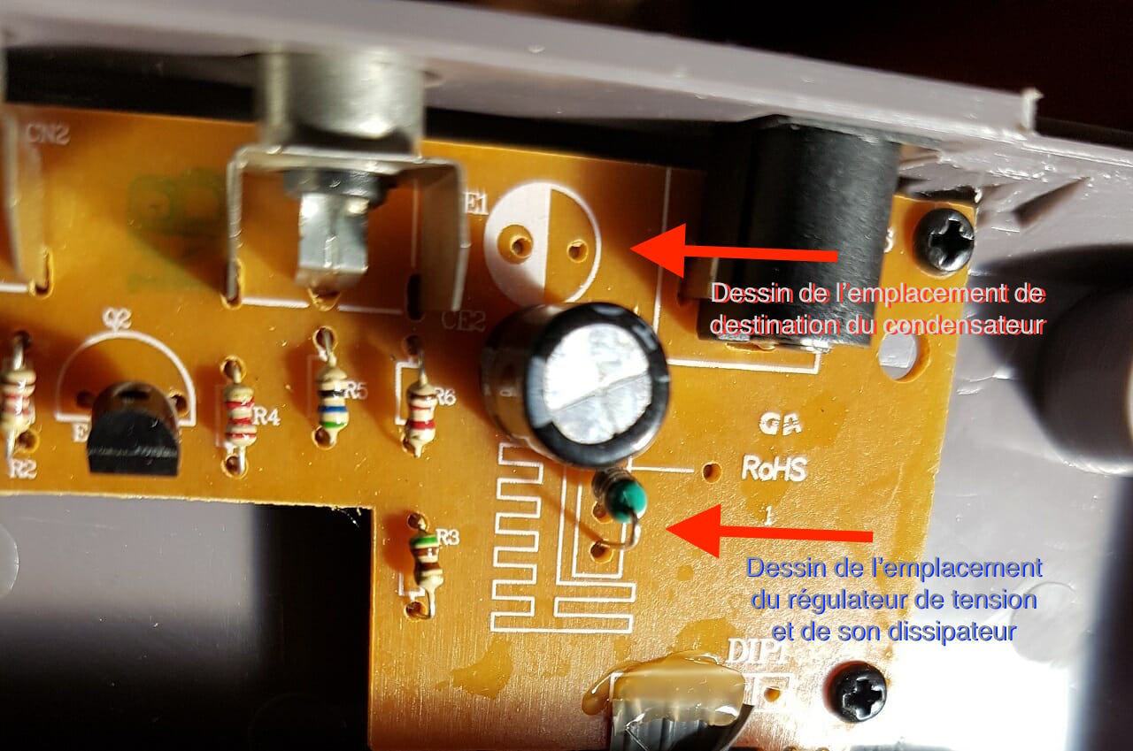 une fois le condensateur déplacé sur l’emplacement du haut, il faut retirer la résistance qui est sur l’emplacement du régulateur de tension et en insérer un.